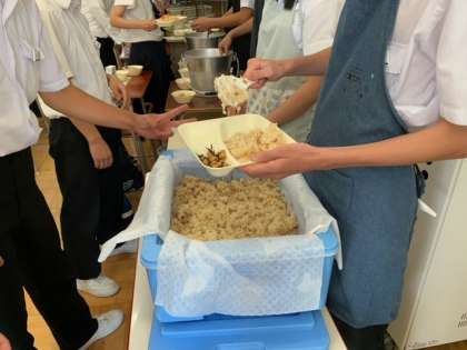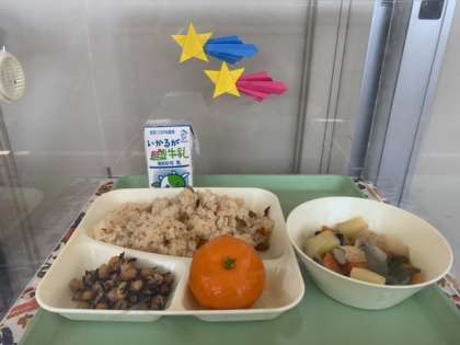 献立は、かやくご飯、鶏肉と野菜の煮もの、ひじき豆、牛乳、冷凍みかんです。