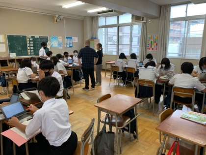 英語の授業は、1人1台パソコンで調べものをしてC-NETの先生に発音も確認してもらっています。