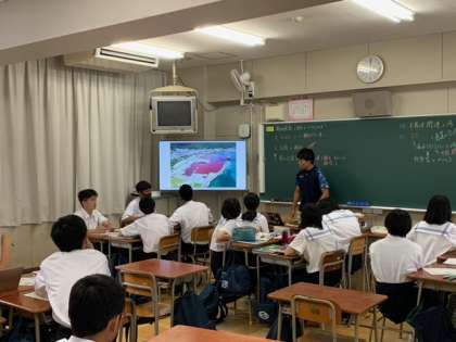 社会科の授業は、電子黒板に写されている内容について自分の意見を出しています。