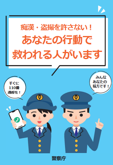 この度、警察庁において、痴漢・盗撮の被害者・目撃者がとることが望ましい行動、警察における捜査の流れの概要、通報・相談窓口の連絡先等について記載したパンフレットを作成し、各都道府県警察に対して送付したところです。