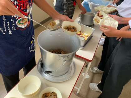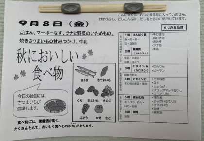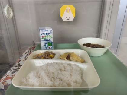 献立は、マーボーなす、ツナと野菜のいためもの、焼きさつまいもの甘みつかけ、ご飯、牛乳です。