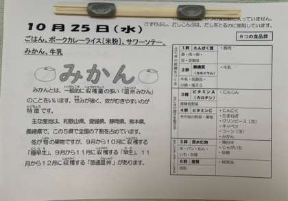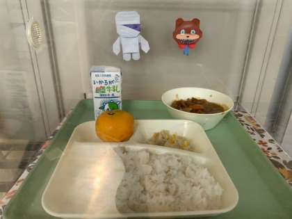 献立は、ポークカレーライス(米粉)、サワーソテー、みかん、牛乳です。