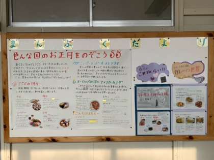 職員室横の廊下に掲示してある「まんぷくだより」には、世界の国々の1月1日のことが書かれています。今年も給食を美味しくいただいて、頑張って行きましょう!