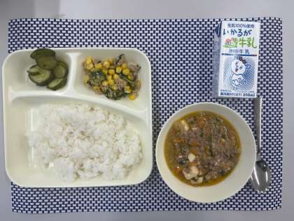 ごはん、マーボーどうふ、きゅうりの中華あえ、ツナとチンゲンサイのいためもの、牛乳