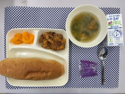 コッペパン、ブルーベリージャム、じゃがいものミートグラタン、レタスのスープ、みかん(缶)、牛乳