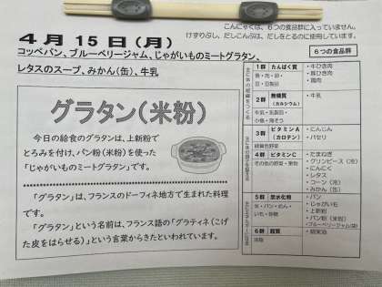 明日から家庭訪問なので、次の給食は、4月23日(火曜日)となります。