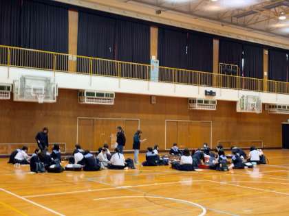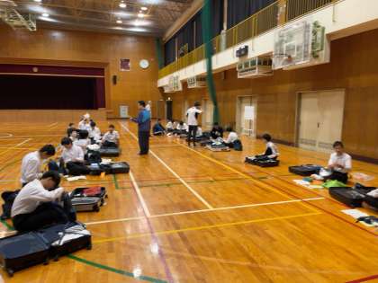 体育館で男女に別れて、荷物の確認をしています。もし忘れているものがあれば、今日の午後に準備をしてもらうことになっています。