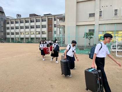出発式を終え、東門からバスに乗り込み、関西空港へ向かいます。