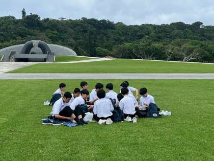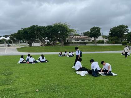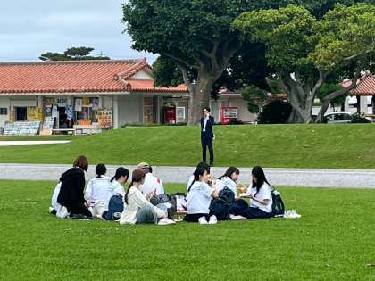 バスを降りて、公園に入って、まずはお昼ごはんを食べています。