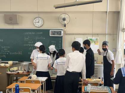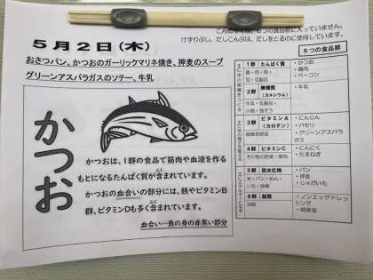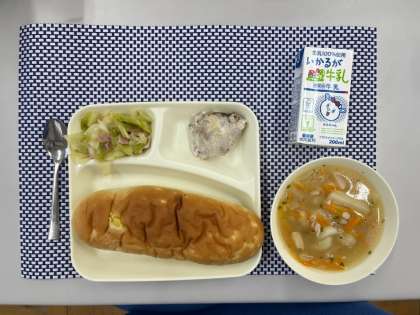 おさつパン、かつおのガーリックマリネ焼き、押し麦のソテー、キャベツのソテー(グリーンアスパラから変更)、牛乳