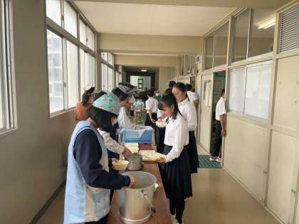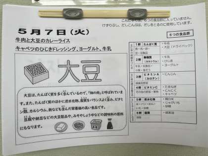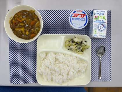 牛肉と大豆のカレーライス、キャベツのひじきドレッシング、ヨーグルト、牛乳