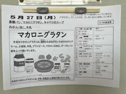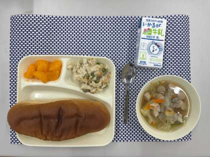 黒糖パン、マカロニグラタン、キャベツのスープ、みかん(缶)、牛乳