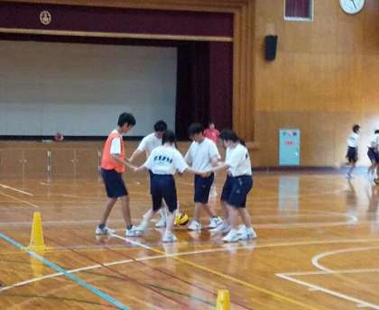 小中合同競技の「絆で勝負!なに輪リレー」の様子です。