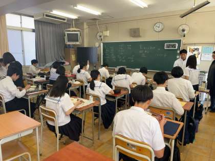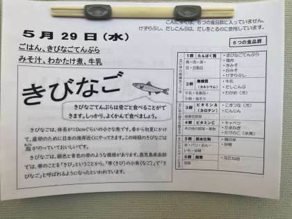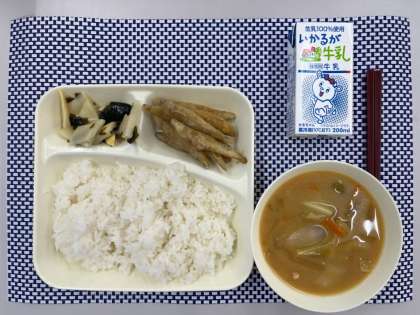 ごはん、きびなごてんぷら、みそ汁、わかたけ煮、牛乳
