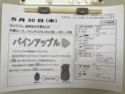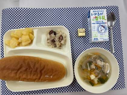 コッペパン、金時豆の中華おこわ、中華スープ、パインアップ(缶)、バター、牛乳