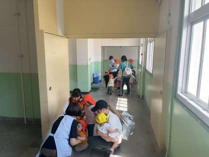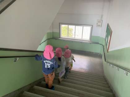 学校の南側に隣接する保育園「すくすくの杜」の園児さんたちが、「水害時訓練」として、保育士さんたちと来校されました。