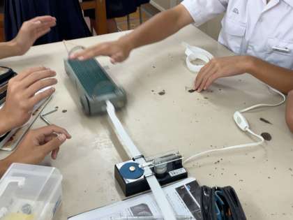 物体が落下する際の速さがどのように変化するのかを実験しながら確かめています。