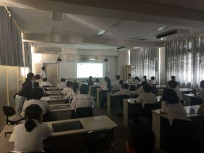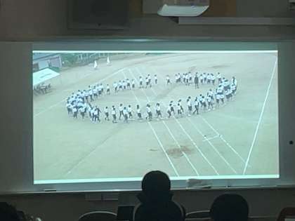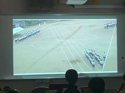 体育大会の集団演技(フォークダンス)を校舎上から撮影した動画を見ながら、集団としての動きなどを確認する時間をもちました。