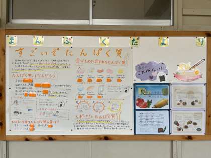 職員室横の壁面に掲示されている「まんぷくだより」。現在は「すごいぞたんぱく質」と題して、たんぱく質の役割やどの食材にどのくらい入っているかを学ぶことができます。