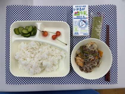 ごはん、牛肉と野菜のいため煮、きゅうりのしょうがづけ、さくらんぼ、焼きのり、牛乳