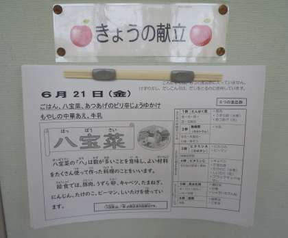 八宝菜の「八」は、8種類という意味ではなく「たくさん」という意味があります。また、「菜」 は「おかず」という意味です。「たくさんの宝を集めたようなおいしいおかず」ですね。給食の八宝菜も、きゃべつや玉ねぎ、たけのこやにんじんなど、たくさんのおいしい材料を使って作っています。今日は何種類の材料が入っているでしょうか。