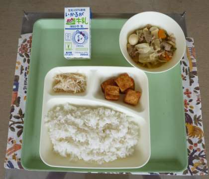 八宝菜、あつあげのピリ辛じょううかけ、もやしの中華あえ、牛乳