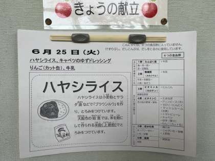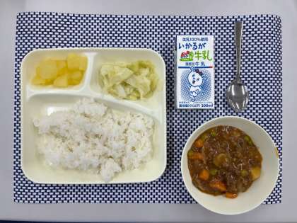 ハヤシライス、キャベツのゆずドレッシング、りんご(カット缶)、牛乳