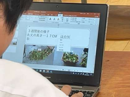 栽培したラディッシュについて、パワーポイントにまとめる作業に取り組んでいます。