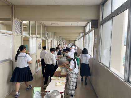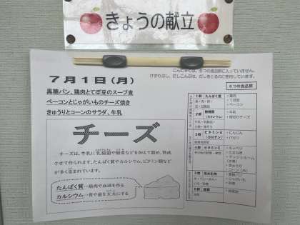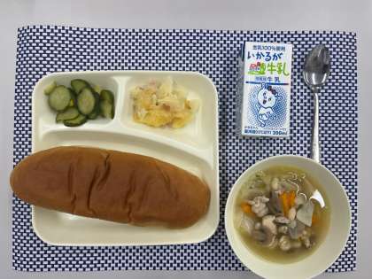 黒糖パン、鶏肉とてぼ豆のスープ煮、ベーコンとじゃがいものチーズ焼き、きゅうりとコーンのサラダ、牛乳