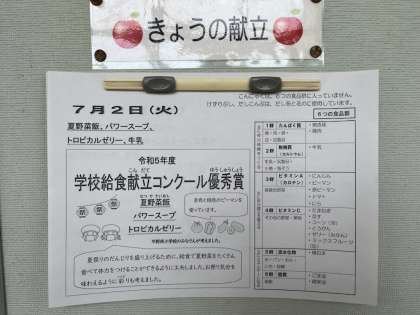 夏野菜飯、パワースープ、トロピカルゼリー、牛乳