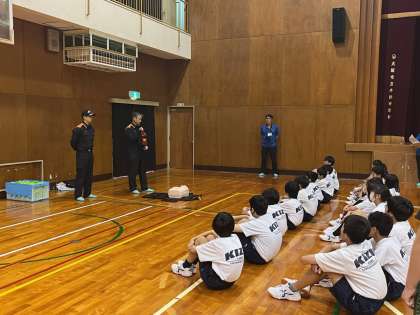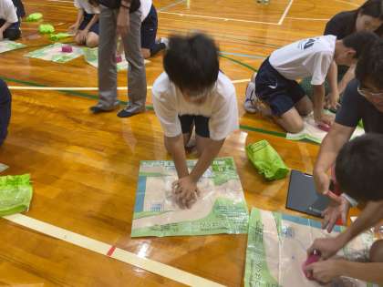 倒れている人を発見した際の対応手順を聞いたり、胸骨圧迫やAEDの使用法を聞いたりした後、実際に体験実習に取り組みました。