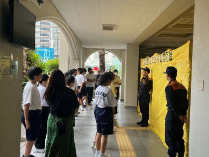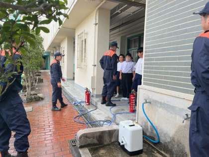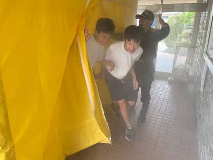 消防署の方の指導で、水消火器の使用訓練と火事に際の煙がどのようなものなのかを体験しました。なお、この煙は、実際の煙ではなく水蒸気を煙に模したものです。