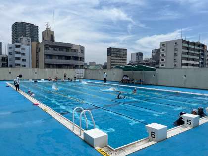男女ともプールで水泳に取り組んでいます。今日は暑いので気持ちよさそうです。