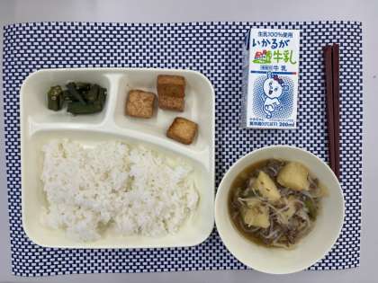 ごはん、肉じゃが、あつあげのみそだれかけ、オクラのおかかいため、牛乳