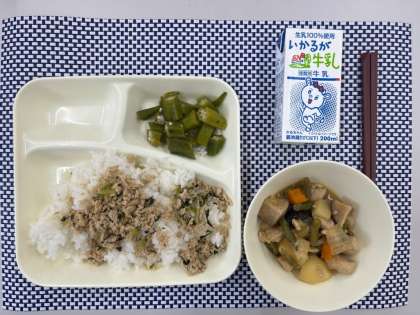 ごはん、鶏肉と野菜のみそ煮、オクラの梅風味、ツナっ葉いため、牛乳