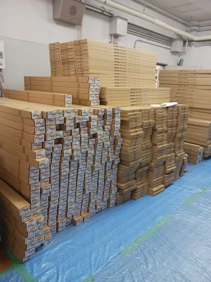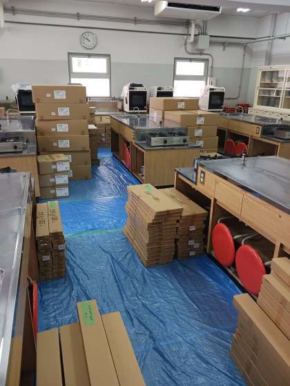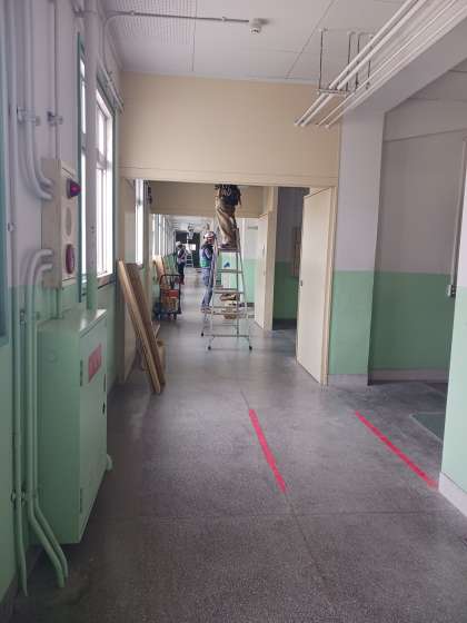 既存市設建築物省エネルギー化基本方針により、普通教室・特別教室・体育館・廊下・階段等の照明器具LED化をすすめています。暑い中、作業員の方々が照明の付け替え工事を行ってくれています。