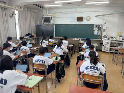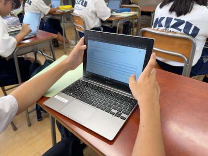 学習者端末を活用して、英語を聞きとって、意味を答える学習に取り組んでいます。