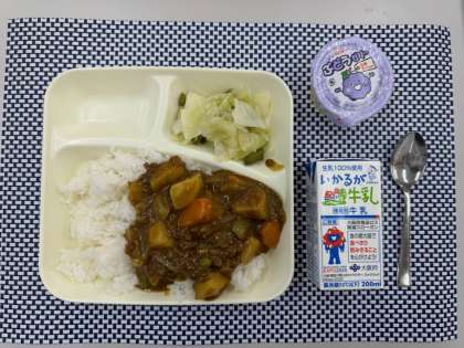 ビーフカレーライス、野菜のピクルス、ぶどうゼリー、牛乳