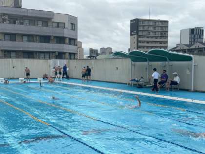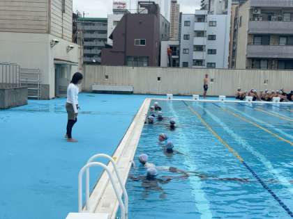 男子はクロールの測定、女子は平泳ぎの足の動きを確認しています。
