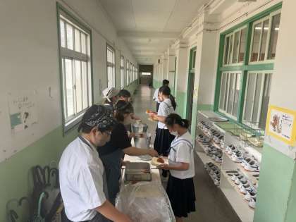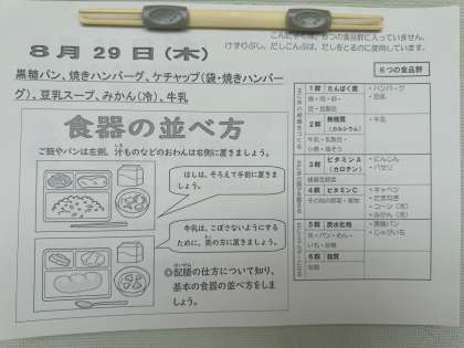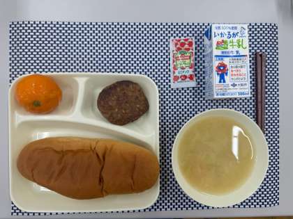 黒糖パン、焼きハンバーグ、ケチャップ、豆乳スープ、冷凍みかん、牛乳