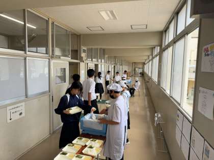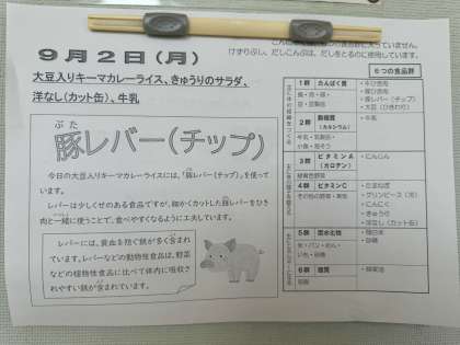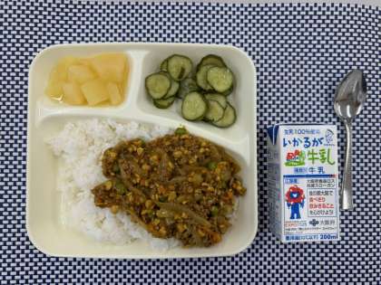 大豆入りキーマカレーライス、きゅうりのサラダ、洋なし(カット缶)、牛乳