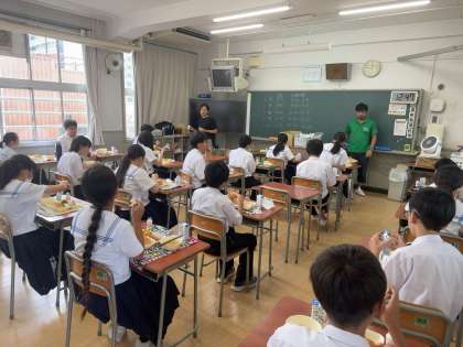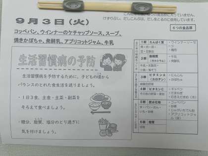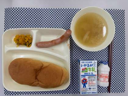 コッペパン、ウィンナーのケチャップソース、スープ、焼きかぼちゃ、発酵乳、アプリコットジャム(写真にはありません)、牛乳