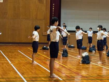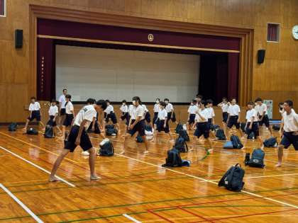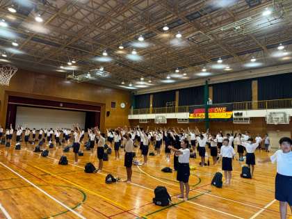 開会式後の体育館で、体育委員の指示で準備運動をしています。