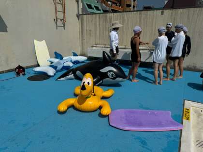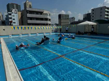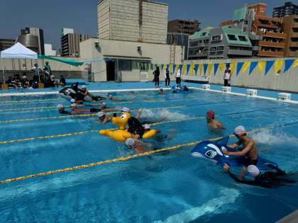 5種目目、浮き輪に人を乗せて、水中の人が引っ張るレースです。