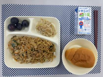 ミニコッペパン、オイスターソース焼きそば、もやしのしょうがづけ、ぶどう(巨峰)、牛乳