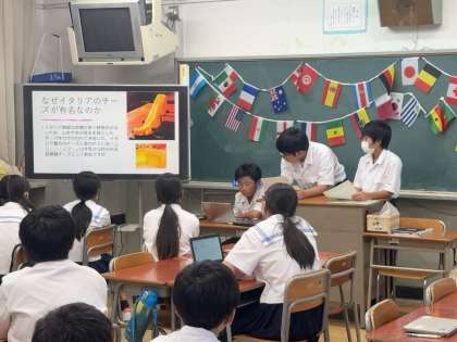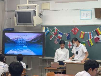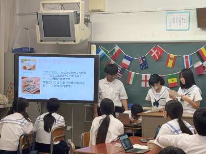 班ごとで調べた国について、パワーポイントを使ってプレゼンテーションしています。