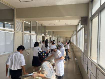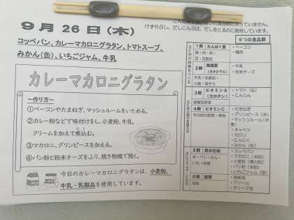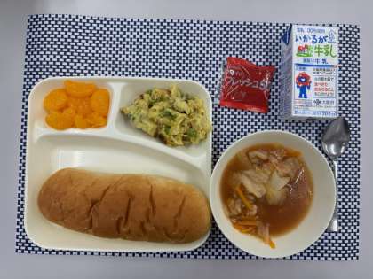 コッペパン、カレーマカロニグラタン、トマトスープ、みかん(缶)、いちごジャム、牛乳