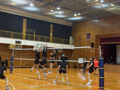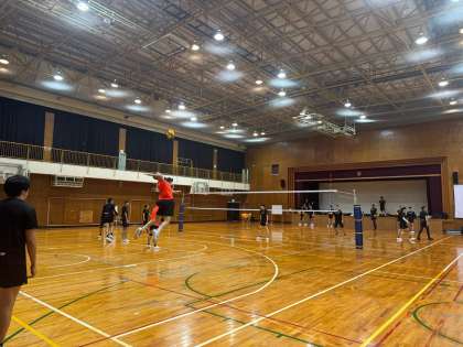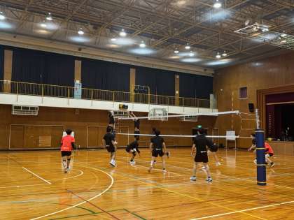 中学生へテスト前で部活動はお休みですが、体育館にてクボタスピアーズ大阪のみなさんが練習に来ています。