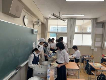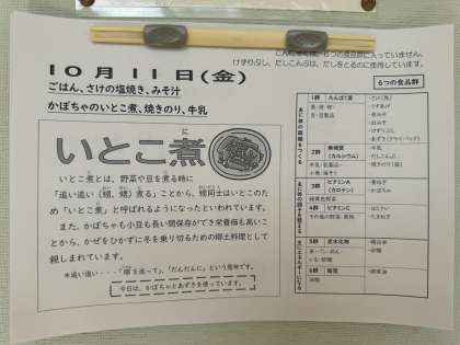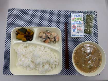 ごはん、さけの塩焼き、みそ汁、かぼちゃのいとこ煮、焼きのり、牛乳