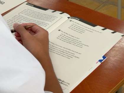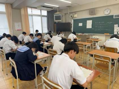 自分の教室に移動して、「読むこと」「聞くこと」「書くこと」のテストに取り組んでいます。